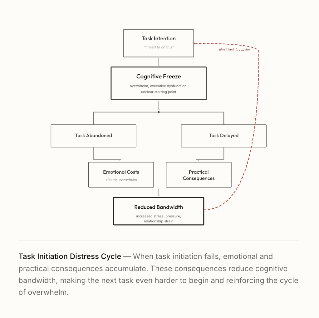 When task initiation fails, emotional and practical consequences accumulate, reducing cognitive bandwidth and reinforcing cycles of overwhelm.