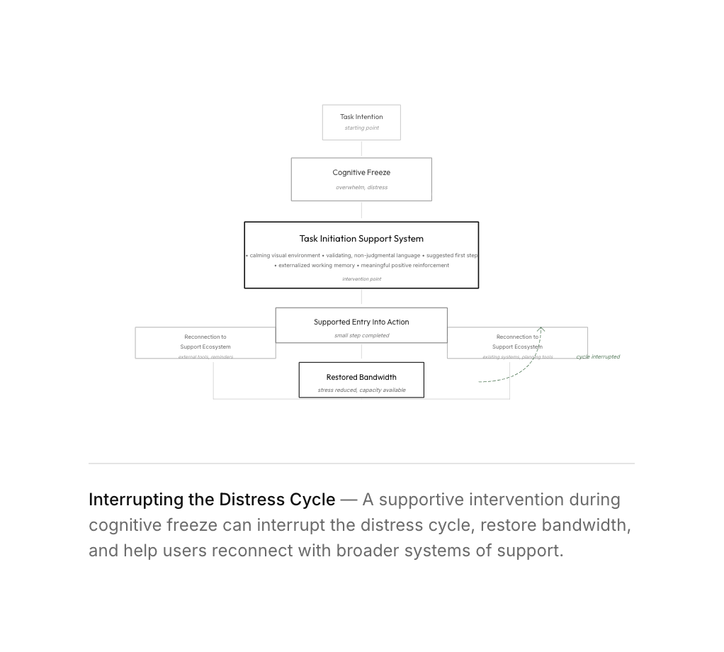 Despite strong problem-solving ability, Alex experiences recurring cognitive shutdown—moments where starting even simple tasks becomes neurologically inaccessible.